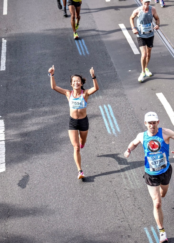 The final part of the race felt like a party. I knew I was running a bit faster than before, but I didn’t look down to check my pace. I was simply excited. This was the first marathon that I was not in pain at any point. I tried to hype up the crowd a couple of times with the biggest smile on my face. The crowd in Germany was not as loud as Boston or Chicago. But people still responded. They were cheering for me left and right. “Go Amanda! My name is also Amanda!” “WOOHOO!” I laughed, thinking that must be one of the weirdest cheers that I have ever gotten.